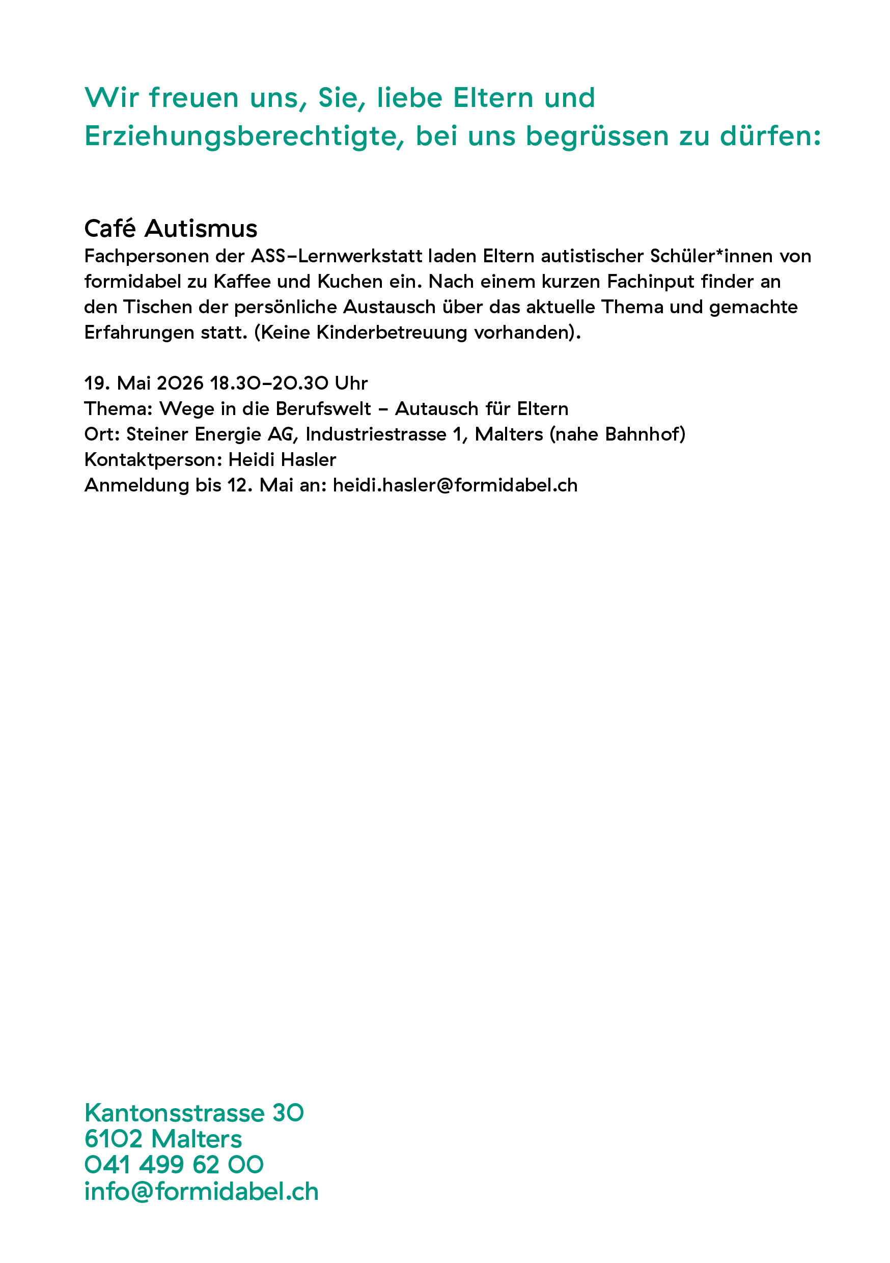 Liebe Eltern. Ganz herzlich laden wir Sie zu unseren bevorstehenden Elternanlässen ein. Die Termine und alle relevanten Details finden Sie auf dem Flyer. Wir freuen uns auf Ihren Besuch. Ihr formidabel-Team